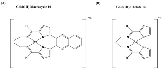 Gold(III) inhibitors of bacterial topoisomerase I [113]. (A) Gold(III) macrocycle 10 and (B) gold(III) chelate 14.