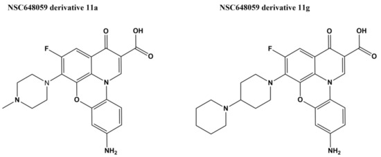 A fluoroquinophenoxazine NSC648059 was initially identified in enzyme-based screening of E. coli topoisomerase I inhibitors [114]. A series of fluoroquinophenoxazine derivatives were synthesized to evaluate the SAR and to probe the structural elements of the fluoroquinophenoxazine core towards type IA topoisomerase target recognition. These derivatives were assayed for selectivity in inhibition of type IA topoisomerases, and antibacterial activity. Comparative molecular field analysis (CoMFA) of the three-dimensional quantitative structure–activity relationship (3D-QSAR) of these fluoroquinophenoxazine derivatives resulted in a model with reasonable statistics (q2 = 0.688 and r2 = 0.806) and predictive power (predictive correlation coefficient r2pred = 0.767). While the structures of these fluoroquinophenoxazines have similarities to fluoroquinolones that target bacterial type IIA topoisomerases, this series of fluoroquinophenoxazines tested for selectivity exhibited much greater potency for inhibition of the type IA bacterial topoisomerase than inhibition of E. coli gyrase, human type topoisomerase I and IIα [114]. Derivative 11a with 6-methylpiperazinyl and 9-amino groups (Figure 6, IC50 = 0.48 µM) showed broad spectrum antibacterial activity (MICs = 0.78–7.6 µM) against bacteria that include Gram-negative E. coli and M. tuberculosis. Derivative 11g with the 6-bipiperidinyl lipophilic substitution showed the most promising antitubercular activity (MIC = 2.5 µM, selectivity index (SI) = 9.8) and was also active (MIC = 50 µM) against a clinical isolate of Mycobacterium abscessus [114,115]. The mechanism of resistance in mycobacteria was investigated by stepwise isolation of resistant mutants in M. smegmatis followed by comparison of the whole-genome sequence of the original strain and mutant isolates. Mutations in genes that affect compound entry and retention were identified instead of mutations in the topoisomerase I gene that might confirm the enzyme as the antibacterial target [115]. Biophysical analysis showed that DNA binding by fluoroquinophenoxazine 11g may contribute to the antibacterial mechanism, but could not account entirely for the direct binding and potent inhibition of the mycobacterial topoisomerase I [115].