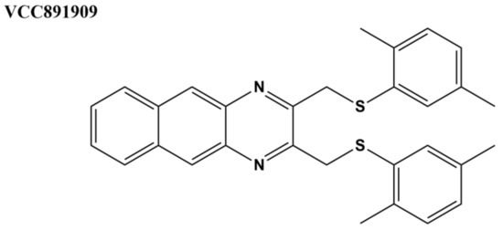 Compounds with antitubercular activity were identified with whole-cell assays from approximately 17,000 molecules in Vichem’s Nested Chemical Library (NCL) [135]. The 639 compounds with MIC values < 6 μM were assayed for inhibition of M. tuberculosis topoisomerase I activity, and the results on the 108 compounds found to be active at 100 μM were used for building machine learning models for M. tuberculosis topoisomerase I inhibitors [97]. A selected set of seven Vichem NCL molecules with benzo(g)-quinoxaline, quinoxaline, or styryl-benzo(g)-quinazoline scaffolds was further characterized [98]. Cytotoxicity was measured against three human cell lines. In silico docking predicted strong binding affinity to specific sites on M. tuberculosis topoisomerase I through interactions with R167 and R114 [97,98]. The interaction of the selected hits with the human ATP-binding cassette (ABC) multi-drug transporters was assessed for potential drug resistance. The human ABCB (MDR/TAP) transporter family plays a major role in multiple drug resistance (MDR) against a variety of tuberculosis therapies, such as fluoroquinolones and aminoglycosides [98]. Most of the hits demonstrated considerable interaction with the transporters, except for VCC891909 (Figure 7). This compound also showed no cytotoxicity in all the human cells lines tested in the cytotoxicity assays with efficient inhibition of M. tuberculosis growth (MIC90 = 10.4 µM against H37Rv) and topoisomerase I activity (complete inhibition at 7.5–10 µM), suggesting that VCC891909 might be a good candidate for further antimycobacterial drug development [98].