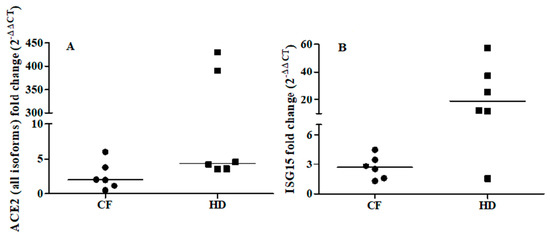 Fold change of ACE2 (all isoforms, Panel A) and ISG15 (Panel B) after ex vivo IFNβ stimulation of the oropharyngeal cells of cystic fibrosis (CF) patients (n = 6) and matched healthy controls (HD) patients (n = 6). ACE2 and ISG15 expressions were examined before (T0) and after (T1) IFNβ stimulation (5 ng/mL) for 24 h. ACE2: CF individuals, T0 vs T1 p = 0.116; HD individuals, T0 vs T1 p = 0.028 by Wilcoxon signed-rank test. ISG15: CF individuals, T0 vs T1 p = 0.030; HD individuals, T0 vs T1 p = 0.027 by Wilcoxon signed-rank test.