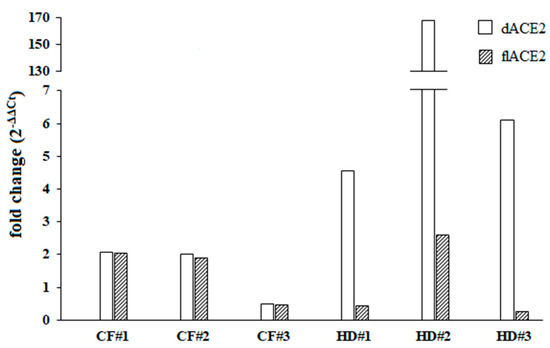 Fold change of the truncated angiotensin-converting enzyme 2 isoform (dACE2) and the full-length angiotensin-converting enzyme 2 isoform (flACE2) was shown individually for three different cystic fibrosis (CF) patients and healthy controls (HD) patients. Both dACE2 and flACE2 expression levels were examined before (T0) and after (T1) IFNβ stimulation (5 ng/mL) for 24 h.