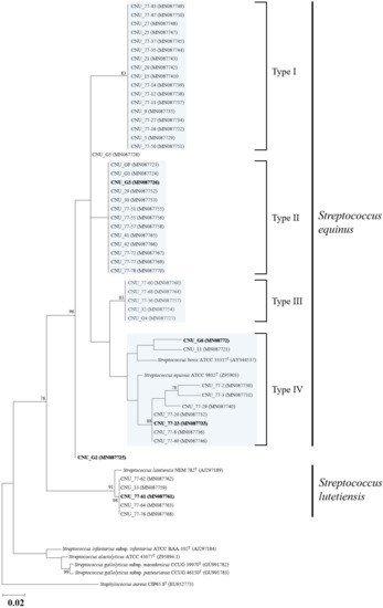 During the bacterial identification in this study, the taxonomical positions of the 51 Streptococcus spp. isolates were not clearly discriminated by 16S rRNA sequence analyses therefore, the sodA gene, reported as one of the most reliable biomarkers for identifying SBSEC species [14,47], was used for species classifications in this study. Accordingly, all 51 isolates were confirmed to belong to the SBSEC and a total of two Streptococcus species including S. equinus (n = 46) and S. lutetiensis (n = 5) were identified. From the Hanwoo and Holstein dairy cattle, a total of 32 S. equinus strains (24 and eight each) were identified whereas a total of 14 S. equinus and five S. lutetiensis strains were obtained from Korean native goats (Table 1). The determined 16S rRNA and sodA sequences of the 51 SBSEC strains were deposited in the GenBank database and are listed in Table 2. Phylogenetic analyses based on the obtained sodA genes using the ML method revealed that the 46 S. equinus isolates were divided into four major types (type I, II, III, and IV) and two individual strains (CNU_G2 and CNU_G5), which were not clustered with the other isolates (Figure 1). Among the four major types, the reference strains of S. equinus (ATCC 9812T (Z95903) and ATCC 33317T (AY344537), which were previously reported as S. bovis) were assigned to type IV by clustering only with some other bovine-originated SBSEC isolates. Moreover, five other isolates, which were obtained from caprine animals and classified as S. lutetiensis (CNU_33, CNU_77-61, CNU_77-62, CNU_77-64, and CNU_77-76), were well clustered with the type strain of the species, S. lutetiensis NEM 782T (AJ297189). A similar result was also obtained from the phylogenetic tree generated using the NJ method.