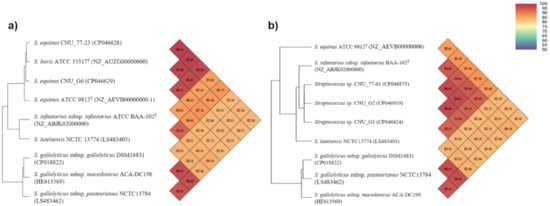 The genomes of the five selected isolates comprised 1.9–2.0 Mbp, consisting of one chromosome each (1.8–1.9 Mbp with 37.4–37.9 G + C content (%)). Although the presence of plasmids in the SBSEC is known to be relatively rare [11], the three strains (CNU_G2, CNU_G3, and CNU_G6) identified as S. equinus possessed a single plasmid, but no antibiotic-resistant or virulence-related genes were detected in it. Detailed features of the sequenced genome and plasmids are indicated in Table 4. Genomic similarities among the five selected isolates and other available type strains of the SBSEC were assessed using the ANI comparisons and the results indicated that the genome of strains CNU_77-23 and CNU_G6 were the most similar to that of S. bovis ATCC 33317T with > 96.0% ANI values (Figure 2a). However, S. equinus strains CNU_G2 and CNU_G3 and the S. lutetiensis strain CNU_77-61 showed <95.0% ANI values against any of the type strains of the SBSEC including S. equinus ATCC 9812T and S. lutetiensis NCTC 13774T. Moreover, the resultant phylogeny based on the OrthoANI values also indicated that these three SBSEC strains were clearly differentiated from the type strains of S. equinus and S. lutetiensis, and were rather closely related to the available genome of S. infantarius subsp. infantarius (GenBank accession No. NZ_ABJK02000000) (Figure 2b). Although the three SBSEC isolates were identified as S. equinus and S. lutetiensis based on the 16S rRNA and sodA gene analyses, these results strongly indicated that the three SBSEC strains (CNU_G2, CNU_G3, and CNU_77-61) could not be classified as S. equinus and S. lutetiensis, and might be categorized as potential new species (or subspecies) in the SBSEC.