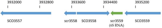 The scr3559 RNA (also called Sc2 in [] or 6S RNA in []) is a 192 nt long transcript that folds into a 6S-like secondary structure []. Its gene is located between SCO3558 and SCO3559. It is noteworthy that it is oriented downstream of SCO3559, as illustrated here in Figure 1 (minus strand) and is in accordance with the RNA sequence shown in both the above-mentioned publications, although the gene is mistakenly depicted in the opposite direction in Mikulík et al. [], where it is dubbed ssrS.