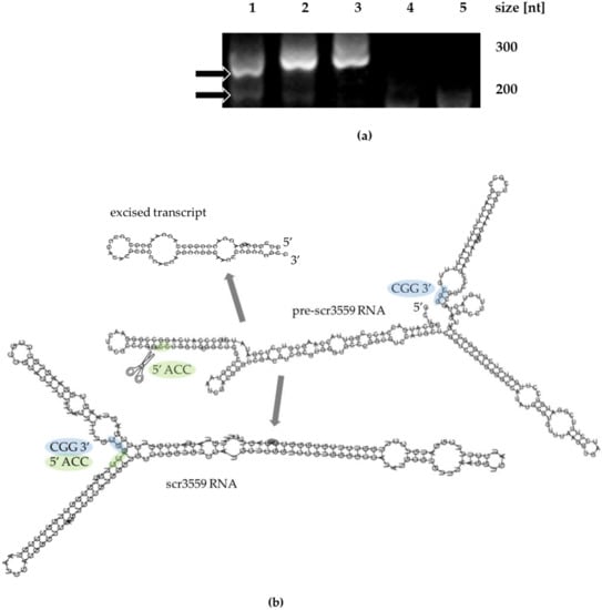 To precisely map the scr3559 transcription start site, a RACE experiment was performed using internal nested primers complementary to the scr3559 RNA. Two RT-PCR products were detected and sequenced (Figure 2). These corresponded to a nascent (pre-scr3559 RNA) and a processed transcript (scr3559 RNA) of sizes 260 and 192 bases, respectively. The transcription start site is thus located at genome position 3934888, whereas the processed 6S-like form, as presented previously, begins at position 3934820. Based on these results, secondary structures of precursor (pre-scr3559 RNA), processed (scr3559 RNA) and excised transcripts were modeled using the RNAfold algorithm (http://rna.tbi.univie.ac.at/cgi-bin/RNAWebSuite/RNAfold.cgi, accessed on 1 September 2021) [] (Figure 2b).