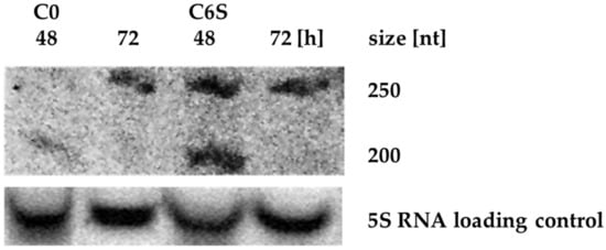 At indicated time points of cultivation in the NMMP liquid medium (with thiostrepton supplemented at 50 µg/mL), cells were harvested and RNA was isolated as described in []. UV spectroscopy and agarose gel electrophoresis were used to assess the quantity and quality of total RNA samples. Total RNA samples were separated on 6% denaturing polyacrylamide gels and were transferred to nylon membranes (BioRad s.r.o., Prague, Czech Republic) using a Trans-Blot semi-dry transfer cell (BioRad) (25 V, 4 °C overnight). The membrane was then UV-cross linked before being hybridized with the 5′-end-labeled oligonucleotide 6SR (ACCGGTAGTACAAAGGACTCAACGG), which corresponded to an internal segment of the scr3559 RNA. The hybridization was performed overnight at 42 °C in ULTRA hybridization buffer (Invitrogen). The detection and quantification of signals were conducted using a phosphorimager (BioRad).