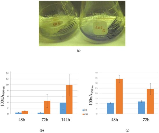 These observations correlated with our microarray analyses, where we observed increased transcript levels for genes whose products drive aerial hyphae development, septation and sporulation in the C6S strain. Although some streptomycete strains, like S. coelicolor, do not develop aerial mycelium and spores in liquid media, transcriptomic data suggest that gene expression in liquid and solid cultures are comparable []. A comparative transcriptomic study revealed that 86% of genes are expressed at the same level in both liquid and solid media, including genes involved in sporulation (bldN, sapA, and whiG, among others) [].