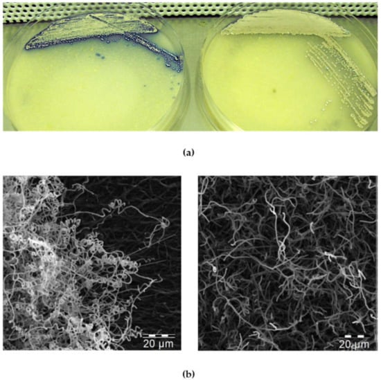 When cultivated on solid agar plates containing thiostrepton (R2YE, SMMS, MS), the C6S strains revealed differences in morphology (small colonies, aberrant mycelium formation, less biomass, and more rapid sporulation compared to the C0 control), and exhibited increased production of secondary metabolites (mainly blue actinorhodin) (Figure 5a). This observation was supported by the data collected using electron microscopy to compare the morphology of C6S and C0 control strains grown in the presence of thiostrepton. The pictures clearly show the accelerated development of the aerial mycelium for the C6S strain (Figure 5b).