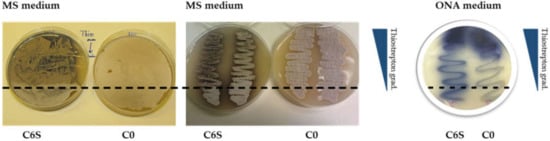 The C6S and C0 strains on MS and ONA medium with a linear concentration gradient of thiostrepton (0–25 μL mL−1 respectively to the blue wedge shown to the right of the plates) after 120 h of cultivation. The dashed line indicates where the thiostrepton gradient begins (most concentrated area is at the top of the image).