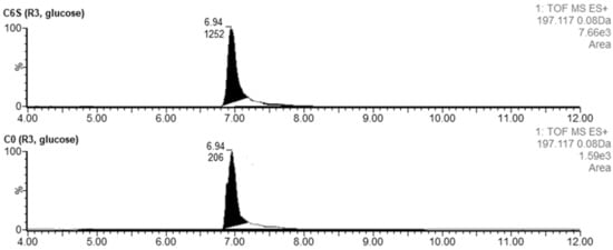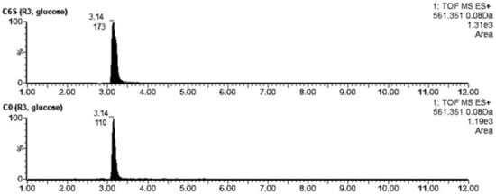 Desferrioxamine B was detected at tR = 3.14 min. The acquired m/z 561.3614 corresponded to the [M + H]+ of desferrioxamine B with a theoretical m/z 561.3625. The production of this metabolite during the cultivation in R3 with glucose was higher in C6S (AUCC6S = 173) than in C0 (AUCC0 = 110) (Figure 8). A similar trend was seen for the production of desferrioxamine E (AUCC6S = 208 vs. AUCC0 = 139) and G1 (AUCC6S = 34 vs. AUCC0 = 21). Desferrioxamine E was detected at tR = 4.72 min. The acquired m/z 601.3546 corresponded to the [M + H]+ of desferrioxamine E with a theoretical m/z 601.3561. Desferrioxamine G1 was also detected (tR = 3.28; m/z 619.3663), although the differences between the C6S and C0 strains were subtle.