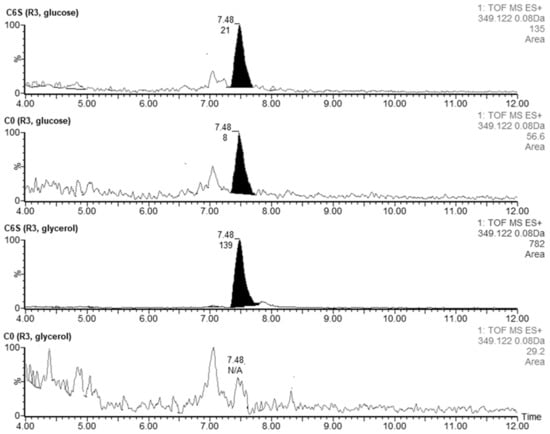 We also confirmed the presence of coelimycin P1 (tR = 7.48), an unusual polyketide alkaloid produced by S. coelicolor []. The acquired m/z 349.1222 corresponded to the [M + H]+ of coelimycin P1 with a theoretical m/z 349.1229. Traces of this substance were detected when culturing both strains in R3 liquid medium with glucose (AUCC6S = 21 vs. AUCC0 = 8) (Figure 9). However, when we used glycerol instead of glucose as an energy source in the R3 cultivation medium, the production of coelimycin was apparent only in the C6S strain (AUCC6S = 139).