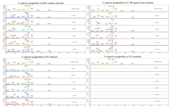A representative protein spectral profile for each storage medium is displayed in Figure 1. High peak intensities were observed and reached up to 1.0 × 104 arbitrary units (a.u.). With regard to the position and the intensity of the measured peaks, Taenia samples stored in LC–MS grade water, ethanol, and sodium chloride showed a similar profile to the original sample, with no significant changes over time. For samples stored in formalin, no protein spectra were found at any time point.