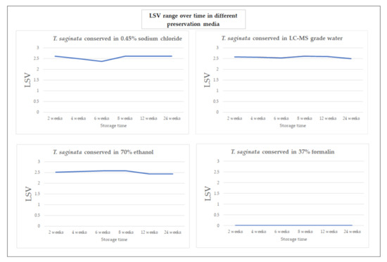 Average LSVs of protein spectra stemming from Taenia proglottids in different preservation media during a 24-week observation period. Spectra were identified using a combination of Bruker Taxonomy and an in-house helminth database.