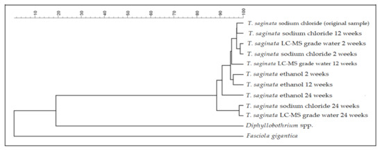 Matrix-assisted laser desorption/ionization time-of-flight (MALDI-TOF) mass spectrometry (MS) is an extensively validated diagnostic technique, which is nowadays routinely used in clinical microbiology laboratories for the species-specific diagnosis of bacteria and fungi in high-income countries [16]. Recently, several studies also reported MALDI-TOF MS, which analyzes pathogen-specific protein spectra to reach a specific diagnosis, as a suitable method for the identification of parasites [13], including helminths (e.g., Fasciola spp. [17], Trichinella spp. [18], and Anisakis spp. [19]). Besides high accuracy, the low cost of reagents needed for MALDI-TOF analysis in comparison to reagents required for PCR assays is a competitive advantage. However, there is uncertainty regarding the standardization of MALDI-TOF analytical protocols, and the effects of pre-analytical factors need to be elucidated. In this study, we utilized T. saginata proglottids to systematically assess whether the use of different sample storage media or the duration of storage affect the composition of the resulting protein spectra, and hence, the ability of MALDI-TOF MS to reach species-specific identification.