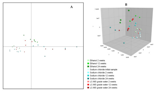 Cluster analysis to display the relatedness of the Taenia proglottids stored in sodium chloride, ethanol, and LC–MS grade water showed that all these proglottids clustered together and showed relatedness levels >85% (Figure 3). Subsequent statistical analyses (both PCA and discriminant analysis) performed on the summary spectra of T. saginata proglottids did not show specific differences pertaining to the different preservation media or the duration of storage (Figure 4), thus indicating an almost identical pattern of the protein spectra.