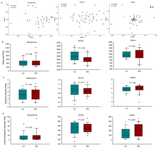 Beta and alpha diversity of the nasopharyngeal, ruminal and vaginal microbiota of virgin yearling heifers from low gain (LG) or moderate gain (MG) dams as determined during the first trimester of gestation. (A) Non-metric multidimensional scaling (NMDS) plots of the Bray–Curtis dissimilarities, (B) number of operational taxonomic units (OTUs), and Shannon (C) and inverse Simpson’s diversity index (D) of each microbial community.