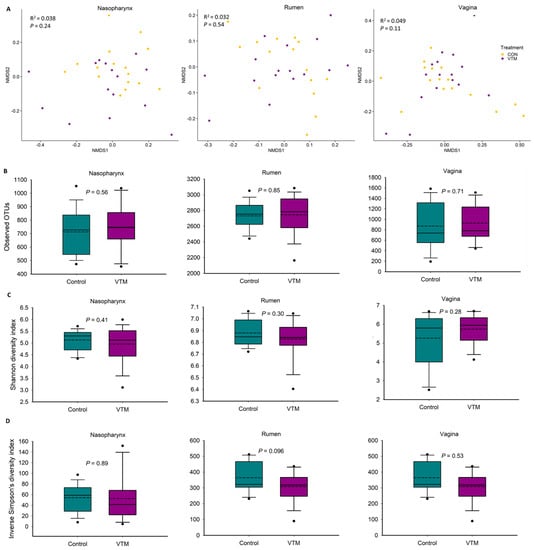 Beta and alpha diversity of the nasopharyngeal, ruminal and vaginal microbiota of pregnant heifers that received a vitamin and mineral supplement (VTM) or a control diet (Control) during the first six months of gestation. (A) Non-metric multidimensional scaling (NMDS) plots of the Bray–Curtis dissimilarities, (B) number of operational taxonomic units (OTUs), and Shannon (C) and inverse Simpson’s diversity index (D) of each microbial community.