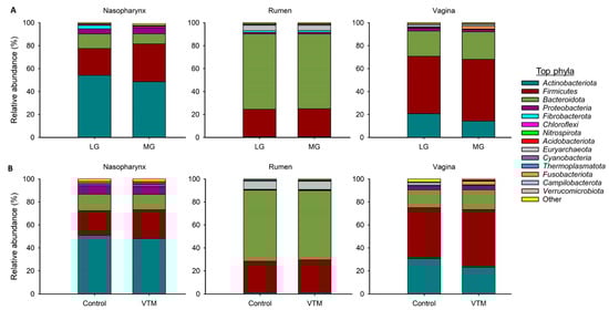 Percent relative abundance of the eight most relatively abundant phyla in the nasopharyngeal, ruminal and vaginal microbiota of (A) virgin yearling heifers from low gain (LG) or moderate gain (MG) dams and (B) pregnant heifers that received a vitamin and mineral supplement (VTM) or a control diet (Control) during the first 6 six months of gestation.
