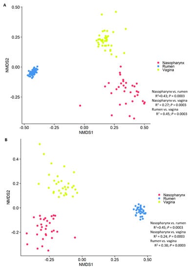 Non-metric multidimensional scaling (NMDS) plots of the Bray–Curtis dissimilarities of the nasopharyngeal, ruminal and vaginal microbiota of (A) virgin yearling and (B) pregnant heifers.
