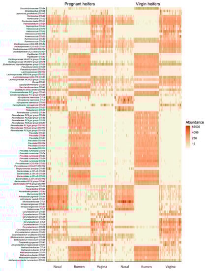 Heat map showing the 100 most abundant OTUs (log4) overall by sample type within each animal group (Pregnant and virgin heifers).