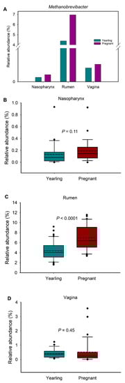 Methanogenic archaea, and in particular members of the Methanobrevibacter genus, have been reported to colonize the intestine of 83-day-old [14], and 5- to 7-month-old calf fetuses [13], as well as newborn calves [40,41]. In addition, we identified here two Methanobrevibacter OTUs (OTU8 and OTU23) that were shared by a relatively high portion (≥65%) of all samples collected from both virgin yearling and pregnant heifers (Table S1). Therefore, we assessed whether the relative abundance of Methanobrevibacter changed in response to pregnancy. For this, we compared the overall relative abundance of Methanobrevibacter spp. within each sample type between virgin yearling (non-pregnant) and pregnant heifers. Overall, the mean relative abundance of Methanobrevibacter in the nasopharynx, rumen fluid and vagina were 0.17%, 5.67%, and 0.47%, respectively (Figure 6A). The relative abundance of Methanobrevibacter in the rumen was greater in pregnant heifers compared to yearling heifers (p < 0.0001), but similar in the other two microbial habitats (p > 0.05) (Figure 6B,D).