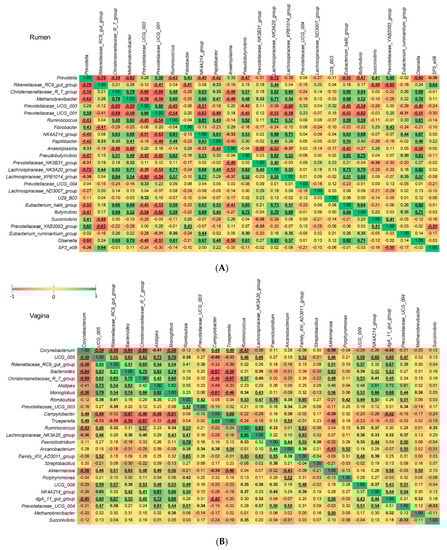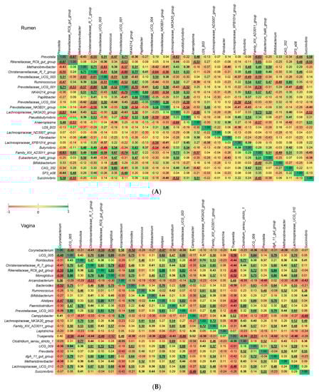 Correlations between the 25 most relatively abundant genera in the ruminal (A) and vaginal (B) microbiota of pregnant heifers. Spearman’s rank correlation coefficients (r). Bold correlation coefficients with 0.01 ≤ p < 0.05, and underlined bold correlation coefficients with p < 0.01.