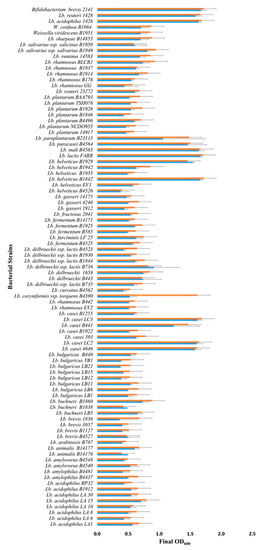 Lactobacillus strains and their sources are shown in Figure 1 and Table S1. The control strains Lactobacillus acidophilus 1426, Lactobacillus reuteri 1428 and Bifidobacterium breve 2141 were a gift from J. Luchansky (USDA, Wyndmoor, PA, USA). Bacteria were stored at −70 °C, and maintained in de Man, Rogosa, and Sharpe medium (MRS, Difco) at 32 °C; B. breve 2141 was routinely passaged under anaerobic conditions. A modified MRS medium (mMRS) (1.0% w/v proteose peptone No. 3; 1.0% w/v beef extract; 0.5% w/v yeast extract; 0.1% w/v; polysorbate 80; 0.2% w/v ammonium citrate; 0.5% w/v sodium acetate; 0.01% w/v magnesium sulfate; 0.005% w/v manganese sulfate; 0.2% w/v dipotassium phosphate) was prepared without glucose, to serve as the basal medium for prebiotic growth studies. Commercial prebiotics fructo-oligosaccharide (FOS) (Raftilose P95; Beneo, Parsippany, NJ, USA) and inulin (Raftilose Synergy 1; Beneo, Parsippany, NJ, USA) were obtained as powders and used to supplement basal mMRS at 1% w/v. The Raftilose P95 used was an oligo-fructose or an enzymatically digested inulin, while Raftilose Synergy 1 was a mixture of long-chain and short-chain inulin (Beneo, Parisippany, NY, USA). Solutions were filtered, sterilized (0.22 µm), and stored at 4 °C.