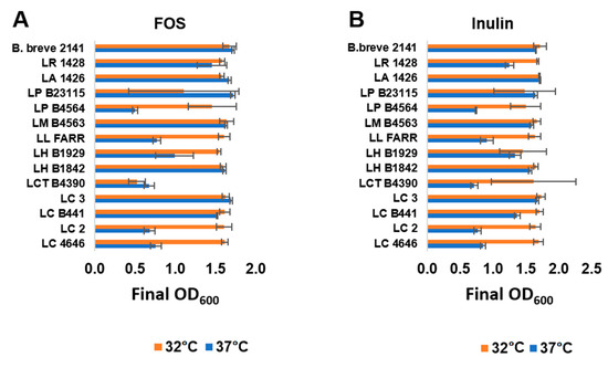 Growth of selected Lactobacillus strain at 32 °C (orange bars) or 37 °C (blue bars) in mMRS broth with (A) 1% FOS or (B) inulin under anerobic conditions. Bars represent the average optical density (600 nm) after 24 h of growth (± standard deviation).