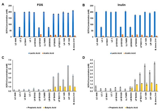Short-chain fatty acid production by the ten Lactobacillus strains capable of fermenting both (A,C) FOS and (B,D) inulin. Bars represent the average concentration of each SCFA (nM): lactic (blue bars), acetic (orange bars), propionic acids (gray bars), and butyric acids (yellow bars) as the average of three replicates (±standard deviation).