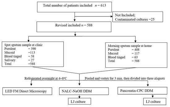 Of 613 sputum specimens processed, direct AFB smear could detect a total of 14.85% (91/613) smear-positive cases. However, LJ detected the presence of MTB and NTM in 22.83% (140/613) and 1.63% (10/613) of the specimens, respectively when treated with NALC-NaOH DDM (reference method). In contrast, sputum samples when digested and decontaminated using pancreatin-CPC DDM, the culture positivity of MTB and NTM were 25.77% (158/613) and that of NTM 2.61% (16/613), respectively. Figure 1 depicts the study profile. Table 1 shows overall results (direct microscopy and culture) obtained after pretreatment with NALC-NaOH and pancreatin-CPC DDMs. Further, 2.28% (14/613) and 3.1% (19/613) of specimens were contaminated in LJ culture after pretreatment with NALC-NaOH DDM and pancreatin-CPC DDM, respectively. After excluding the 4.07 % (25/613) of contaminated culture (obtained after pretreatment with all the methods studied), the culture positivity was found to be 23.64% (139/588) and 1.7% (10/588) for MTB and NTM infections, respectively (after pretreatment with NALC-NaOH DDM). Similarly, after excluding 4.07% (25/613) contaminated culture results, 26.87 % (158/588) and 2.72% (16/588) patients were confirmed with MTB and NTM infections (in culture), respectively (after pretreatment with pancreatin-CPC DDM).