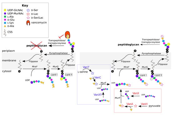 Vancomycin inhibits cell wall synthesis. It does so by binding the d-alanyl-d-alanine (d-Ala-d-Ala) residues of the muramyl pentapeptide portion of lipid II, a precursor in peptidoglycan synthesis (Figure 1) [25,26,27,28]. This binding event interferes with crosslinking of the pentapeptide and formation of mature peptidoglycan (Figure 1) [29], ultimately causing osmotic cell lysis.