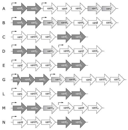 Organization of enterococcal vancomycin-resistance gene clusters for resistance types A–N. Regulatory genes are shown in dark gray, remodeling genes in white, and accessory genes in gray gradient. Arrows indicate the approximate positions of promoters.