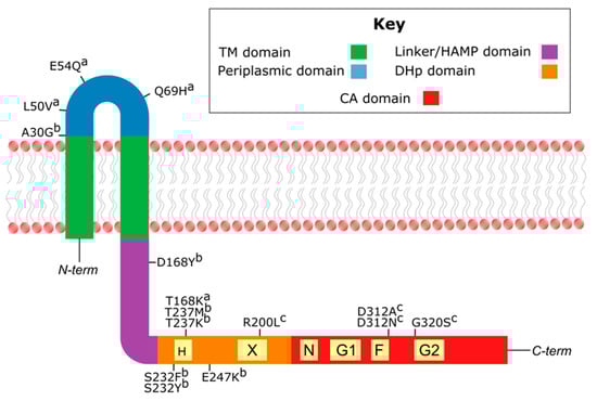 - Bhate, M.P.; Molnar, K.S.; Goulian, M.; DeGrado, W.F. Signal transduction in histidine kinases: Insights from new structures. Structure 2015, 23, 981–994. [Google Scholar] [CrossRef] [PubMed]