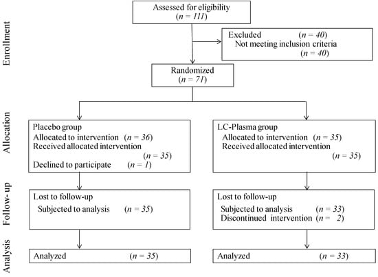 The consolidated standards of reporting trials (CONSORT) flow diagram for the study is shown in Figure 1. Eligible subjects were randomized and allocated to two groups: the placebo group (36 adults) and the LC-plasma group (35 adults) by using a stratified randomization method as described in the Materials and Methods section. One subject in the placebo group declined to participate after allocation. During the intake period, two subjects from the LC-plasma group were lost to follow-up due to personal commitments on the sampling day. As a result, data from 35 volunteers in the placebo group and 33 in the LC-plasma group were included in the analysis. The baseline characteristics of the participants are summarized in Table 2. No adverse events attributed to the test supplement were observed during the test period.