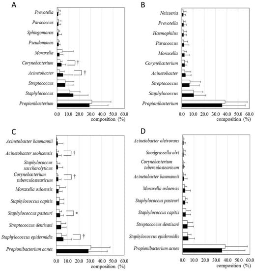 Relative composition of the 10 most abundant bacteria in the placebo and LC-plasma groups. Bars indicate the mean with standard deviations. Closed rectangles, 0 W; open rectangles, 8 W. (A) Genus composition in the placebo group. (B) Genus composition in the LC-plasma group. (C) Species composition in the placebo group. (D) Species composition in the LC-plasma group. † p < 0.10, * p < 0.05.