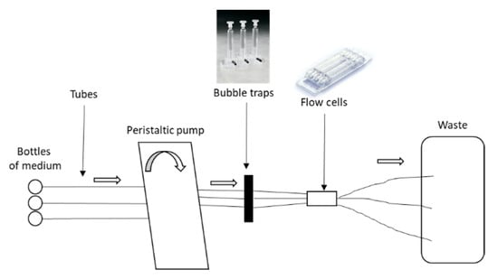 In this dynamic model, C. acnes biofilms were grown for 96 h at 37 °C in flow chambers (IBI Scientific, Dubuque, Iowa, USA). The system was assembled and sterilized by pumping a 0.2% hypochlorite solution through the system for 2 h using a peristaltic pump. The system was rinsed with sterile water and then by diluted medium (BHI diluted 1/10e with sterile water) for 1 h with a rate of 20 mL/h. Flow chambers were inoculated by injecting a 5-day-old bacterial culture diluted at 1/20. Inoculated chambers were flipped upside-down, without flow for 3 h to let bacteria adhere. Then, fresh diluted medium was pumped through the system at a constant rate of 0.2 mL/h during four days. The flow cells model was detailed in Figure 1. After 96 h, biofilms were stained using the Live/Dead BacLight bacterial viability kit (Molecular probes) at a ratio 1:5 of Syto-9 to propidium iodide. Biofilms were observed using a LMS 710 NLO confocal laser scanning microscope (Zeiss), and two joined fields were captured. The observation of the biofilm was carried out twice for the strains C2, C5, C8, and C18 after internalization and once for the other experiments. The homogeneity of the samples was checked by traversing the observation field and the most representative area was chosen for the acquisition of the image. Three-dimensional reconstructions and fluorescents volumes were generated using Imaris software.