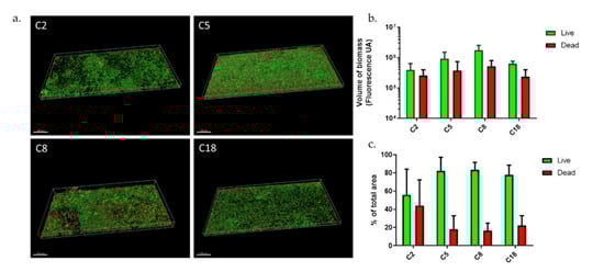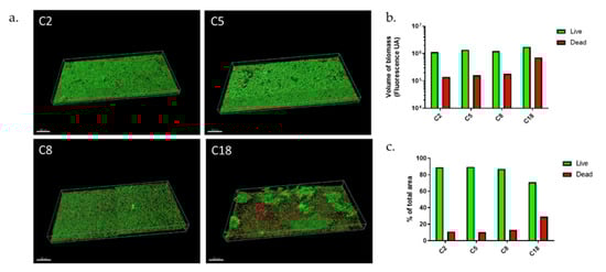 For different purposes, we evaluated the proportion of living and dead bacteria (Figure 2c) within biofilm. First, if the biofilm is mainly composed of living bacteria, these are cells that might be released much later and therefore induce new contaminations on other sites []. The second reason is that the quantity of dead bacteria can also release DNA after lysis, which participates in matrix formation and therefore the resistance of the biofilm []. C2, C5, and C8 strains formed a biofilm whose composition in living bacteria was very similar, close to 90%. Only the C18 strain had a lower proportion with 70% live bacteria. This could be explained by the presence of large aggregates which could lead to bacteria death []. From a global point of view, the percentage of living bacteria within biofilm was higher in the dynamic than in the static model with the exception of C18 strains; with an average of 88.5% (±1%) for C2, C5, and C8 vs. an average of 56.8% (±9%) in the static model (data from reference []).