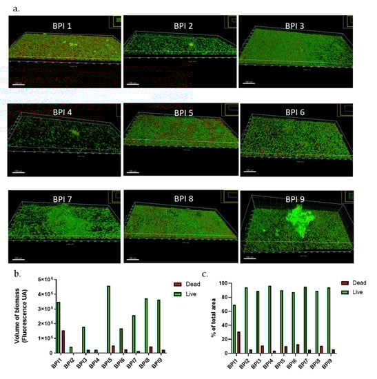 On average, BPI biofilms in flow cells models had a total volume of 2.8 × 106 ± 0.6 UA while the commensal strains were on average twice as small (1.3 × 106 ± 0.4 UA). However, some strains, such as BPI 2 or BPI4, showed a very fine biofilm, with only a few aggregates. In our previous publication [], we have observed that BPI biofilms were more important than commensal ones before internalization. In this case, our results were concordant. Concerning the live/dead proportion, BPI biofilms in dynamic models were composed of 69 to 97% of live bacteria with an average of 89.5 ± 2.7% (Figure 4c), which is higher than in static models (61.2%) []. Again, the proportion of live bacteria was different in the two models confirming that permanent supply of a “fresh” medium with nutrients and oxygen in the flow cell model should allow better survival of bacteria within biofilm. To verify this hypothesis, we will have to repeat experiments in controlling these parameters.