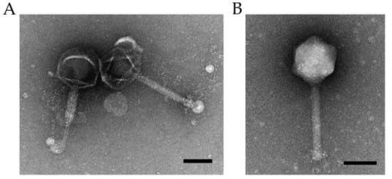 Bacteriophage (phage) is a kingdom of viruses that invades bacterial cells while replicating in them []. As bacteriophages have the capability to induce bacterial metabolism disruption and death, they are emerging as alternative treatment modalities for bacteria with antibiotics resistance [,,,]. Ever since the first discovery of bacteriophages in the 1910s, efforts have been made to use them as therapeutic agents [,]. The diverse features of lytic bacteriophages, including their host specificity, exponential growth in numbers at the site of infection, and the capability to overcome bacterial resistance, have made them an attractive alternative to antibiotics [,,,]. Previous studies in bacteriophage therapy indicate that one of the crucial factors for successful phage therapy is appropriate phage selection. Some biological features, such as phage specificity, efficacy, and lytic phage, should be considered in order to select suitable phages [,].