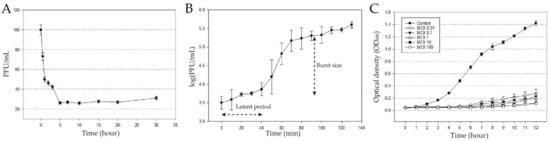 For the one-step growth assay (done in triplicate), the host strain was cultured in TSB to reach 1.5 × 106 CFU/mL in the exponential phase. Phage lysate was added to reach MOI = 0.01, followed by a 5 min adsorption period. After 2 min of centrifugation at 14,000× g, the supernatant was removed, and an identical volume of TSB (37 °C) was added. After resuspension, 100 μL of bacteria and phage suspension was sampled in 10-min intervals for 140 min and diluted with PBS for the double-layer plaque assay.
