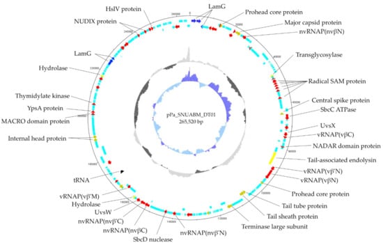 Genome map of pPa_SNUABM_DT01. The functional ORFs are indicated by specific colors according to their functional categories. The GC plot is indicated by the black and grey hologram, and the GC skew is demonstrated with the blue hologram. Red: nucleotide-metabolism-related ORFs; Yellow: lysis related ORFs; Green: structure-and-packaging-related ORFs. Black: tRNA; Sky-blue: hypothetical ORFs.