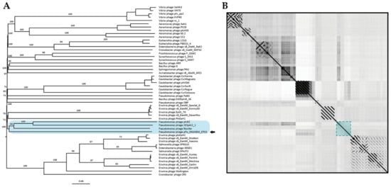 Whole genome comparison of the pPa_SNUABM_DT01 genome and jumbo-phages. Skyblue box: the cluster including pPa_SNUABM_DT01. (A) Phylogenetic tree constructed using VICTOR with genome sequences of jumbo-phages. (B) Dot plot constructed with concatenated genome sequences used in phylogeny.