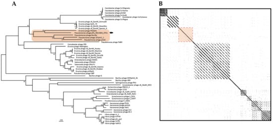 Genome sequences were obtained from the GenBank database. The whole genome phylogeny was constructed using the Genome-BLAST Distance Phylogeny method in the Virus Classification and Tree Building Online Resource (VICTOR) []. The resulting intergenomic distances (100 replicates each) were used to infer a balanced minimum evolution tree with branch support via FASTME, including subtree pruning and regrafting postprocessing for D0. The tree was visualized using FigTree [,]. For conserved gene phylogeny construction, we utilized major capsid protein and terminase large subunit genes and used MEGA v10.1.8 software with the maximum-likelihood method with 1000 bootstrap replications []. A dot plot was constructed using the default settings in the Gepard application []. For the ANI calculation, a Kostas lab ANI calculator (Kostas lab, Atlanta, GA, USA) was used. With Mauve, the genomes of the Pseudomonas phages, pPa_SNUABM_DT01, phiKZ, and Noxifer, were compared [].