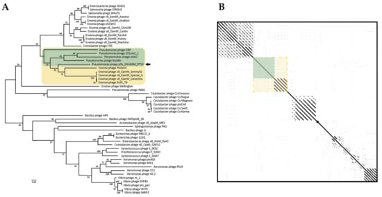 Conserved gene (terminase large subunit) comparison of pPa_SNUABM_DT01 and jumbo-phages. Yellow box: the cluster including pPa_SNUABM_DT01. Green box: the phages do not show diagonal lines in the cluster (Yellow box). (A) Phylogenetic tree constructed using MEGA-X by maximum-likelihood with major capsid protein sequences of pPa_SNUABM_DT01 and jumbo-phages. (B) Dot plot constructed with concatenated genome sequences used in phylogeny at a word size of 12.