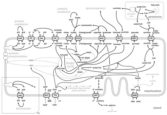 Role of mitochondrial carriers in cell metabolism. Participation of individual mitochondrial carriers in cellular metabolic pathways is indicated. Dashed arrows indicate transport that mediate the maintenance of mitochondrial pool of respective metabolite rather than metabolic flux. In the dotted rectangle, the transport of adenine nucleotides under anaerobic and fermentative conditions is shown. Outer mitochondrial membrane is not shown as it is permeable for all depicted solutes. Abbreviations: AAC—ADP/ATP carrier, AGC—aspartate-glutamate carrier, CTP—citrate carrier, CRC—carnitine carrier, DIC—dicarboxylate carrier, MPC—pyruvate carrier, NDT—NAD+ carrier, ODC—oxodicarboxylate carrier, ORT—ornithine carrier, PIC—phosphate carrier, SAL—ATP-Mg/Pi carrier, SAMC—S-adenosylmethionine (SAM) carrier, SFC—succinate/fumarate carrier, TPC—thiamine pyrophosphate carrier, SAHC—S-adenosylhomocysteine, SAM—S-adenosylmethionine, ThMP—thiamine monophosphate, ThPP—thiamine pyrophosphate.