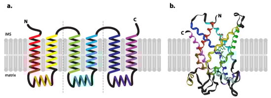 Structure of transporters of the mitochondrial carrier family. Mitochondrial carriers typically consist of three repetitive analogous modules. Each module, roughly 100 amino acids in length, contains two transmembrane α-helices in the matrix side connected with another short α-helix. Short hydrophilic loops connecting individual repetitive modules as well as both C- and N-termini of the protein are located in the intermembrane space (IMS) [47,48]. Depicted are (a) a schematic of membrane topology and (b) a 3D structure of bovine ADP/ATP carrier (AAC1). Same colour coding is used in both panels. The 3D model was generated by iMol 0.40 software using structural data from [49]. Molecule of the inhibitor, carboxyatractyloside, bound to the carrier is shown as a balls-and-sticks model.