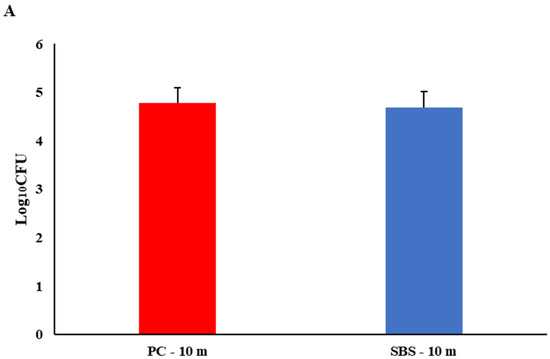Biofilm formation on PVC was evaluated by using methods previously described [40,41]. Briefly, sterile coupons were initially inoculated in 1.0 × 109 cfu/mL of SH suspension (bacterial attachment step) in 30 mL of LBNN broth for 5 h under static conditions at 37 °C. Coupons were then removed using sterile forceps, rinsed with 1 mL of cold PBS to remove loose cells, and placed in a new tube with 30 mL of LBNN for 6 days under static conditions (biofilm formation step) at 37 °C. The media were replaced every 48 h. Coupons were rinsed with 1 mL of cold phosphate-buffered saline (PBS) and air dried for 5 min in a HEPA-filtered biological safety cabinet during media replacement. All biofilm work was conducted in a biosafety cabinet. After 6 days, coupons were rinsed, dried, and placed in a treatment of 30 mL of SBS at a pH of 3.5 or sterile tap water for 10 min, 8 h, or 24 h at 37 °C.