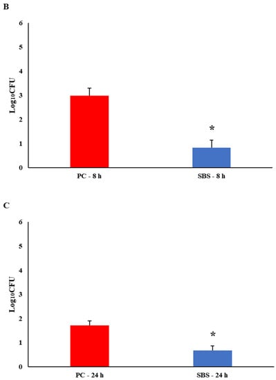 Biofilm production is critical to bacterial persistence [44]. Salmonella biofilm on processing surfaces is a food industry concern due to the potential cross-contamination of poultry products [19]. Maharjan and colleagues found that even with consistent water line cleaning, microbial residue would fluctuate depending on the time and location of flocks [45]. Ten minutes was not enough contact time for SBS to significantly decrease SH biofilm (Figure 1A). Sodium bisulfate significantly reduced SH biofilms when applied for 8 h (2.15 log cfu/mL) and 24 h (1.05 log cfu/mL; Figure 1B,C). Overall, SH was a poor biofilm former, which is similar to previous findings [46]. Authors believe SH may have decreased at 24 h due to no supplementation of nutrient medium. Sodium bisulfate could be an efficient and safe way to reduce SH biofilms in poultry drinkers.