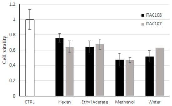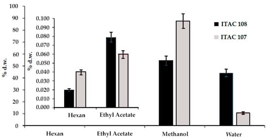 The yield of fractionated extractions using solvents with different polarity index is showed in Figure 1. The increase in polarity from hexane to methanol was associated with an increase in the extraction yield. Therefore, the highest yields were found using methanol, but different values were observed between the strain Synechococcus sp. ITAC107 (87.6% d.w.) and Cyanobium sp. ITAC108 (54.4% d.w.). Interestingly, a further increase in polarity achieved by switching from methanol (P = 5.1) to water at 80 °C (P = 10.2) did not correspond to an increase in extraction yield. Moreover, the water extract was higher for Cyanobium sp. ITAC108 (44.1% d.w.) compared to Synechococcus sp. ITAC107 (10.6% d.w.). Hexane and ethyl acetate fractions showed lower extraction yields that ranged between 0.02% d.w. (Cyanobium sp. ITAC108) and 0.04% d.w. (Synechococcus sp. ITAC107) in hexane and 0.08% d.w. (Cyanobium sp. ITAC108) and 0.06% d.w. (Synechococcus sp. ITAC107) in ethyl acetate, respectively.