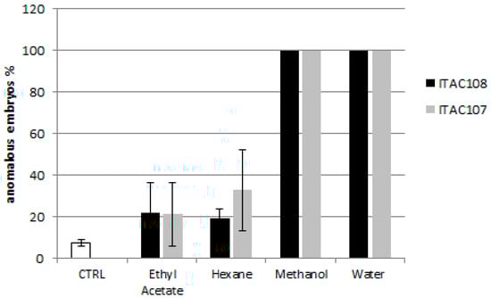 Three replicates for each extract were performed. The results of the sea urchin embryo toxicity test are reported as the mean of the percentage of deformed embryos ± SD.